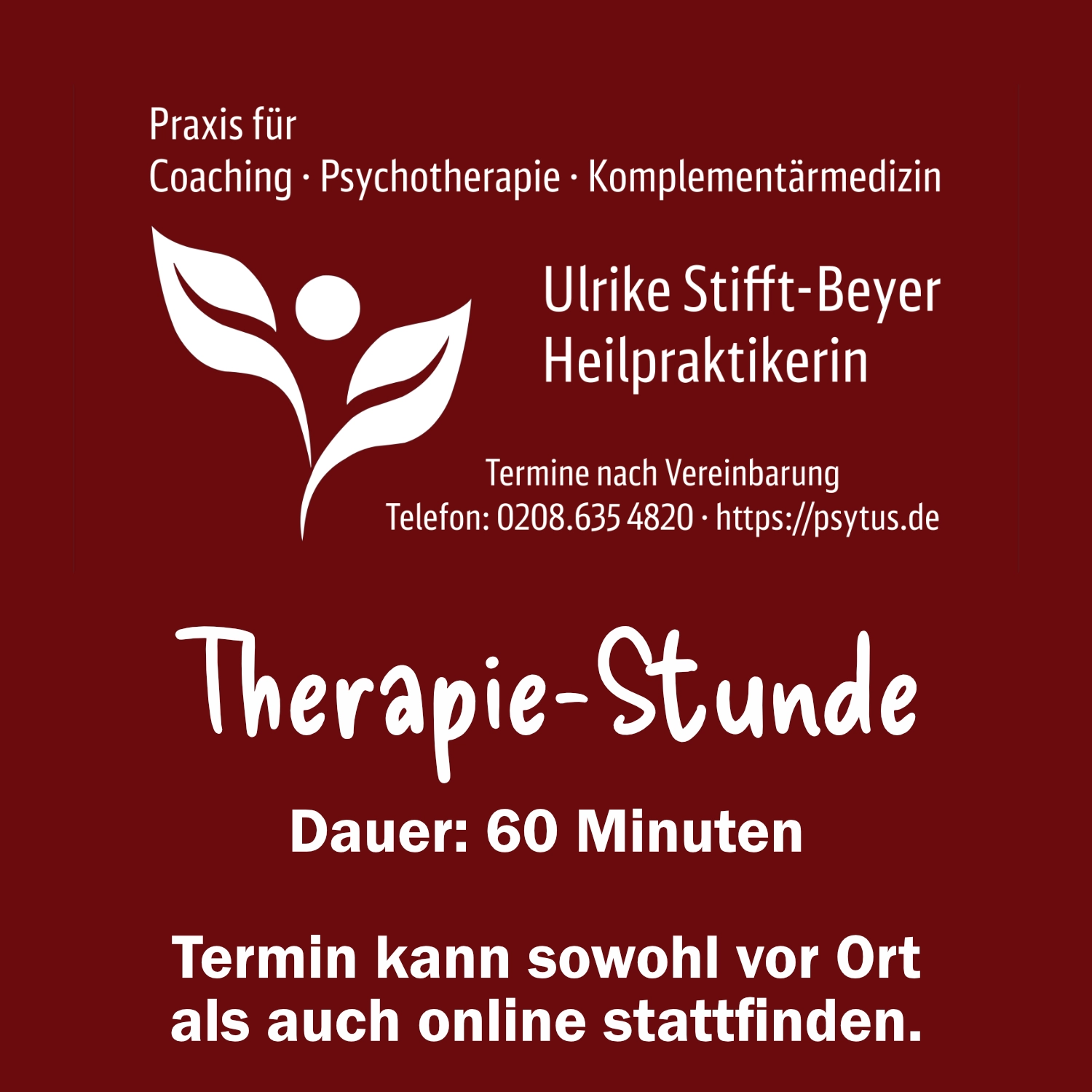 Bitte beachten Sie, dass der Kauf und die Bezahlung dieses Produktes nur die finanzielle Abwicklung darstellt. Den konkreten Termin können Sie dann anschließend entweder über Jameda (Ulrike Stifft-Beyer – Heilpraktikerin, Heilpraktikerin für Psychotherapie in Oberhausen) buchen oder in telefonischer Absprache mit mir (049.208.635 4820) festlegen.